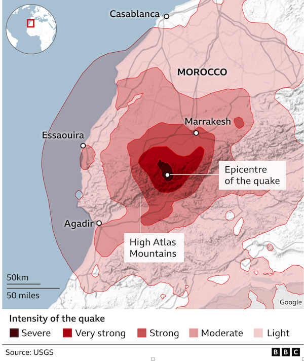 Friday 8th September 2023 - The earthquake’s depth was 11.5 miles, and the epicenter was 44 miles southwest of Marrakesh (French: Marrakech) near the town of Adassil, in the High Atlas Mountains, Al Haouz province. There are many picturesque but tiny villages in the mountains, several of which have been devastated.